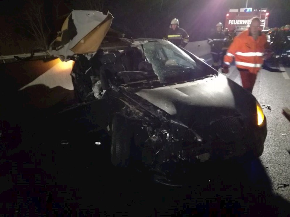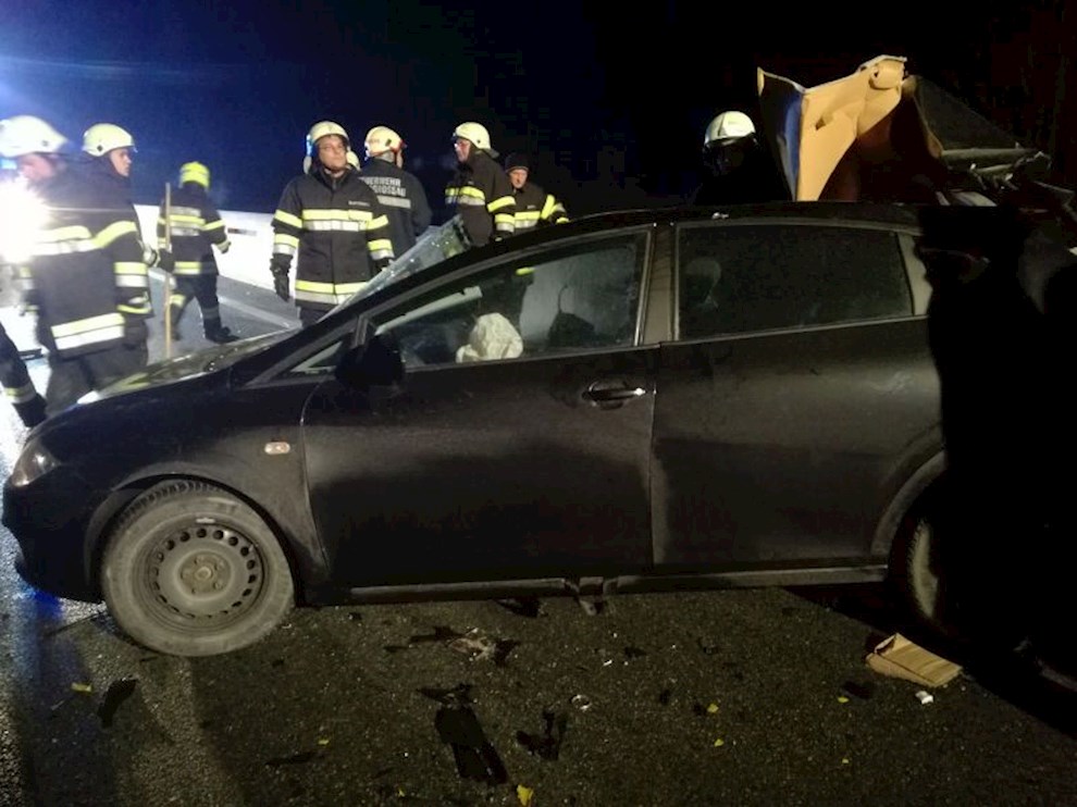 Aus ungeklärter Ursache fuhr ein PKW einem LKW auf, dabei wurde die Gesamte Beifahrerseite des PKWs aufgerissen! Die Fahrerin wurde mit Verletzungen unbestimmten Grades ins LKH eingeliefert.