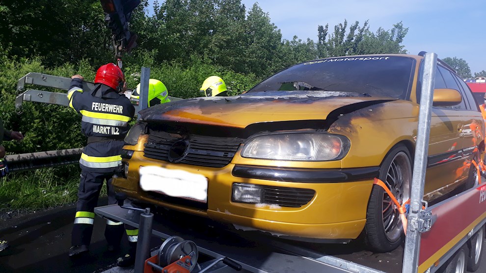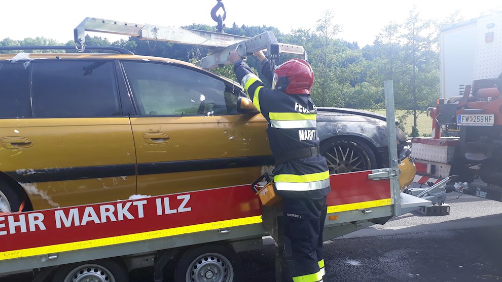 Gemeinsam mit den Kameraden der FF Ilz konnten wir das Feuer, welches bei unserer Ankunft bereits auf den Innenraum des Fahrzeugs übergegriffen hatte, rasch löschen. Nach dem Reinigen der Fahrbahn von Schaummittel und ausgelaufener Betriebsmittel. wurde der Kombi mittels Kran auf einen Anhänger verladen und abtransportiert.