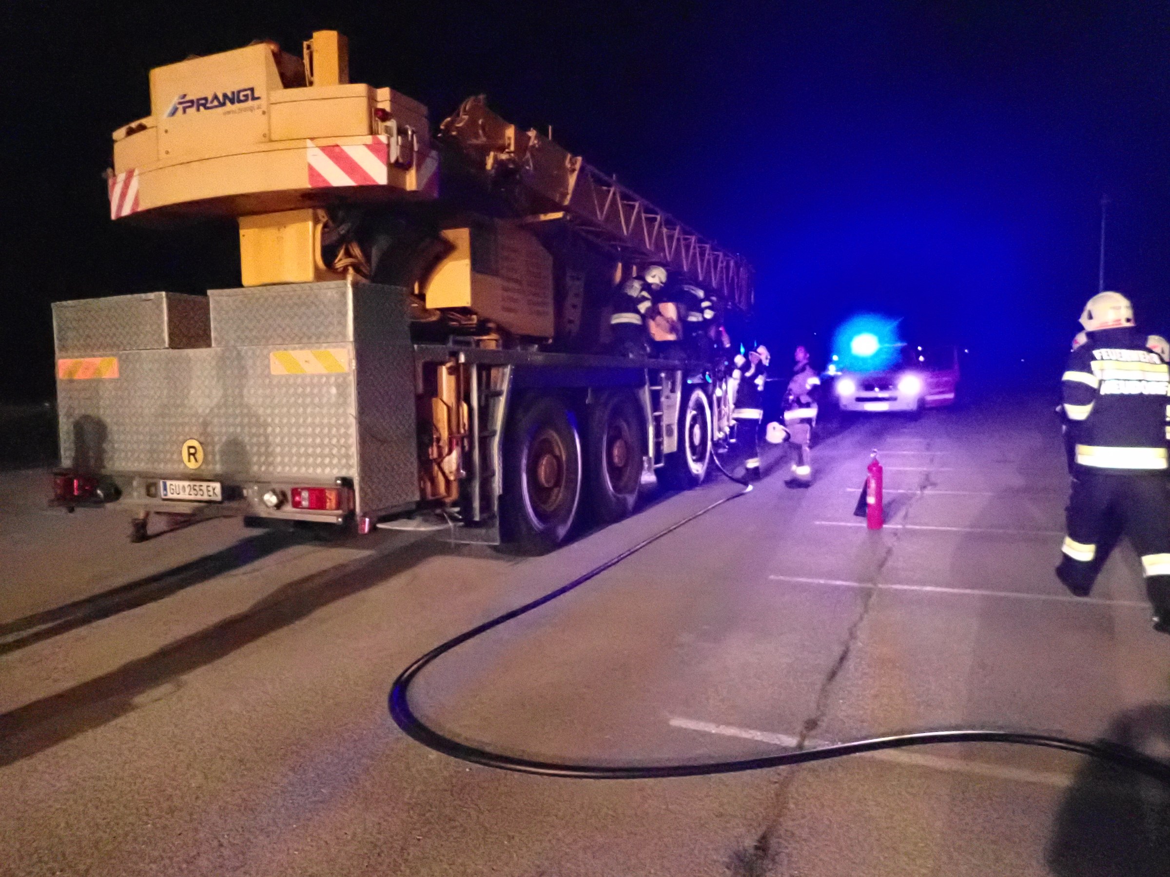 Am 09.08.2022 um 21:43 Uhr wurden wir zusammen mit der Feuerwehr Großwilfersdorf zu einem Kranwagenbrand am Parkplatz der Firma Haas in Großwilfersdorf gerufen.