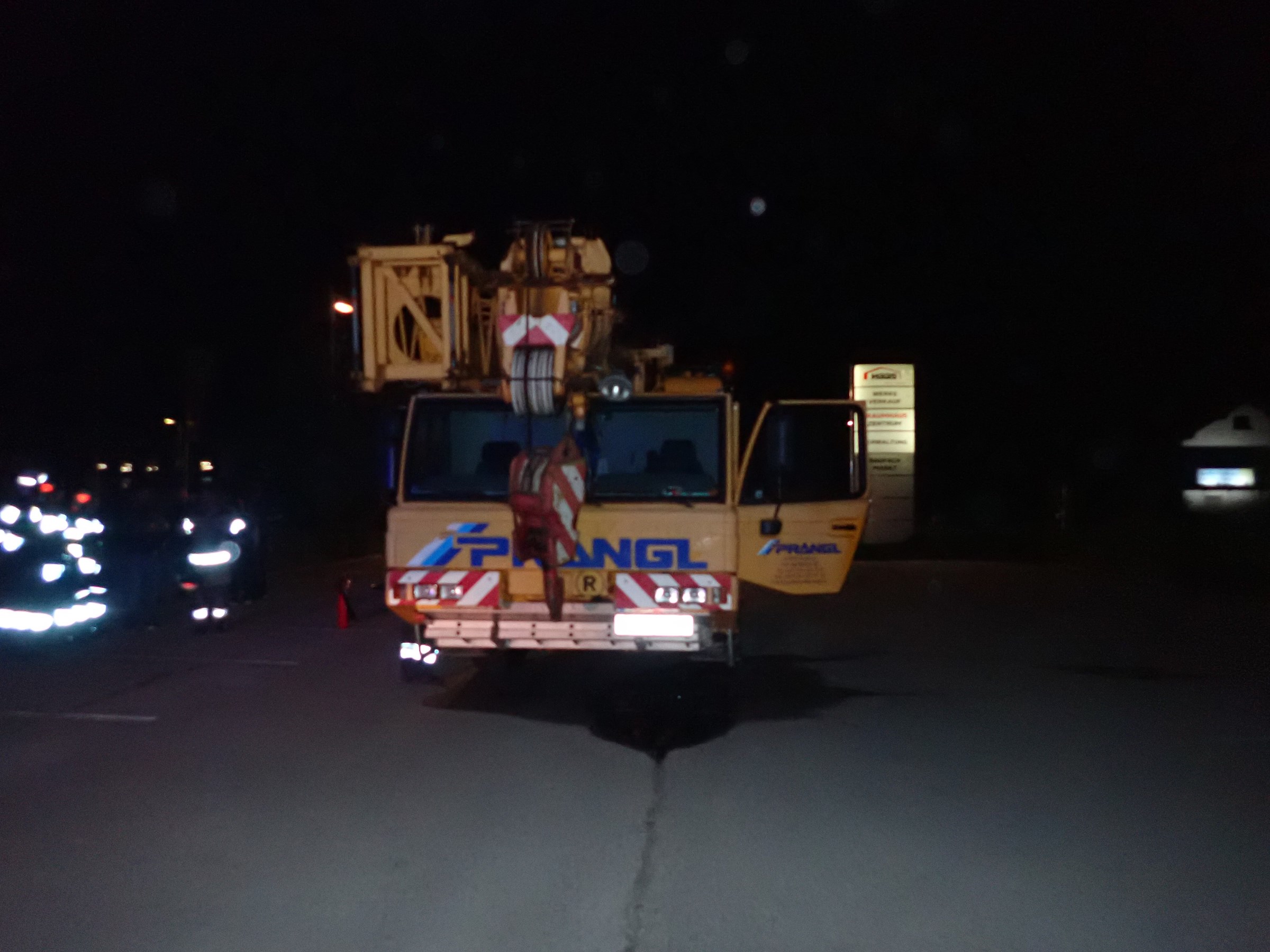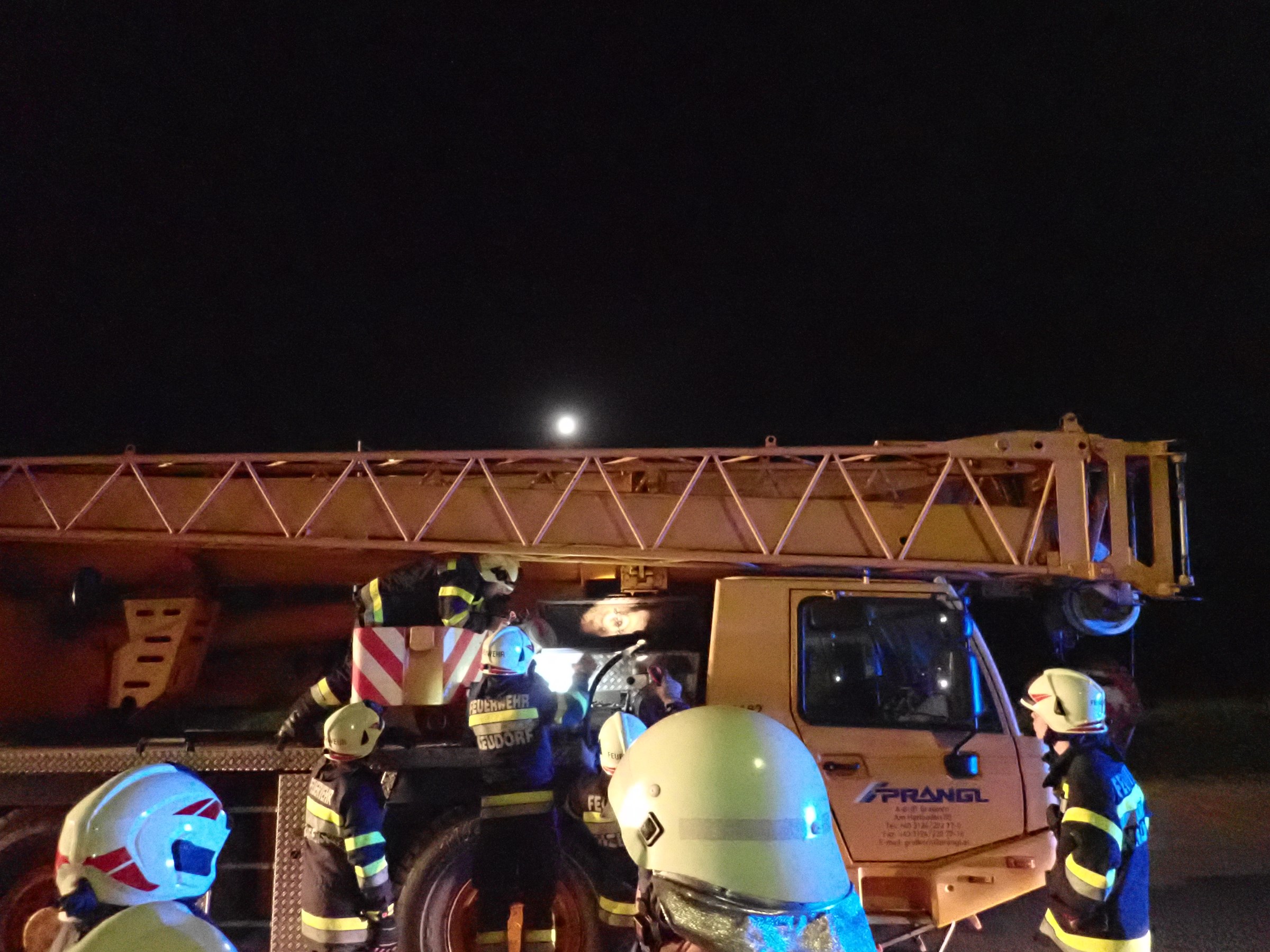 Der Kranwagenfahrer wurde von einem aufmerksamen PKW-Fahrer auf Funkenflug im Motorraum hingewiesen, daraufhin stellte sich der Fahrer mit seinem Fahrzeug auf den Parkplatz der Firma Haas und alarmierte die Feuerwehr. Nach der Absicherung des Fahrzeuges wurden nötige Löscharbeiten erledigt und der Kleinbrand gelöscht.