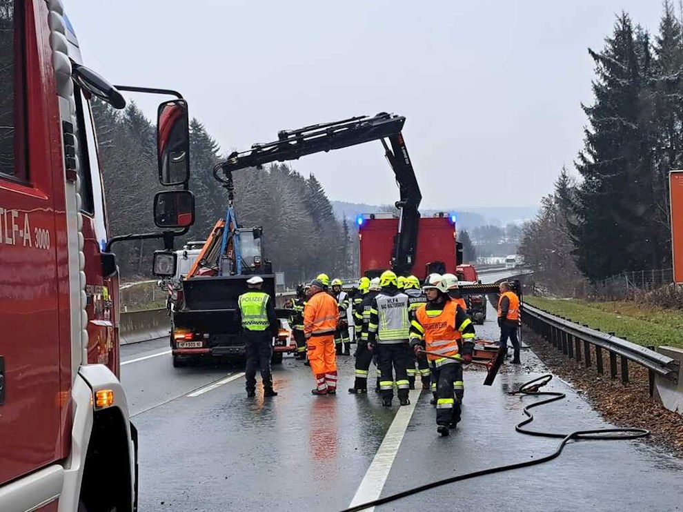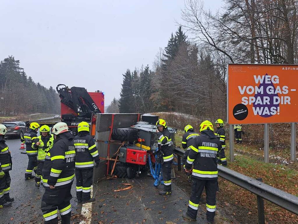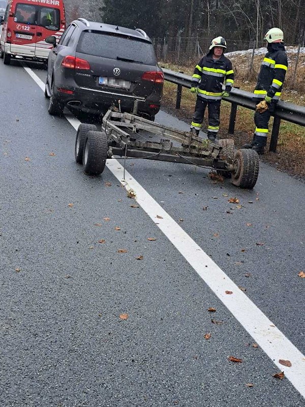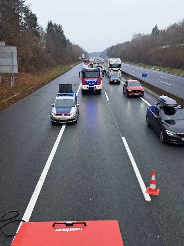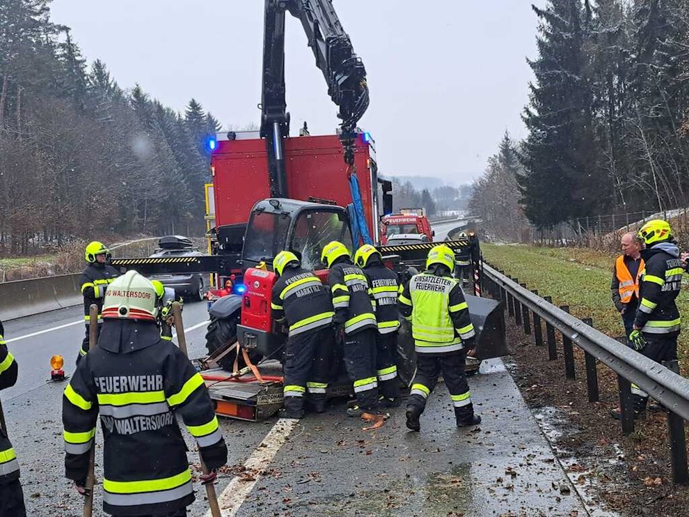 In Fahrtrichtung Wien kurz vor der Abfahrt Sebersdorf touchierte ein Hängergespann die Betonleitwand, wodurch das Plateau samt Ladung vom Anhängergerissen wurde. Der Hoflader, welcher sich noch festgezurrt am Plateau befand, kippte auf der Fahrbahn zur Seite.