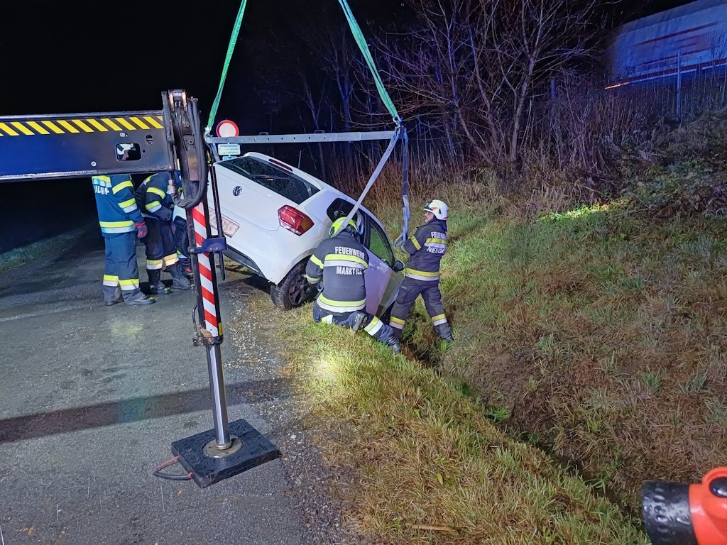 Um das Fahrzeug schonend bergen zu können wurde die FF Markt Ilz nachalarmiert. Mittels Kran des SRF konnte der PKW aus dem Graben gehoben und Verkehrssicher abgestellt werden.