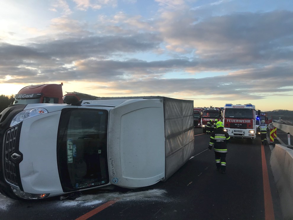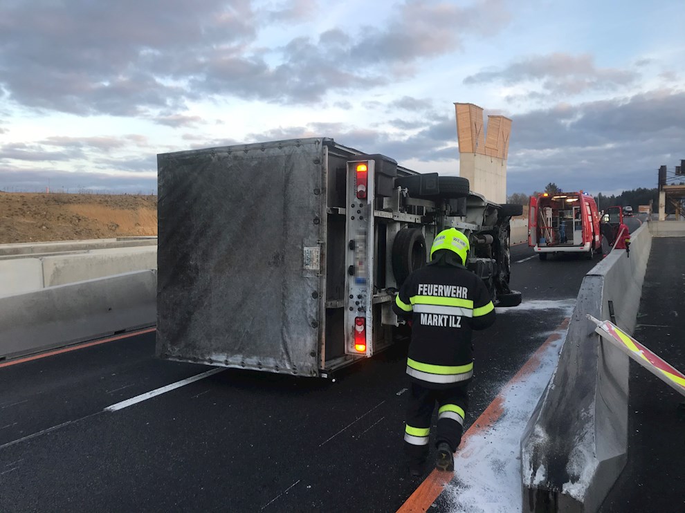 Der LKW fuhr aus ungeklärten gründen auf die Betonleitplanke im Baustellenbereich auf und stützte dadurch zur Seite. Da glücklicherweise niemand verletzt wurde konnte der Transporter rasch aufgestellt und zum nächsten Parkplatz geschleppt werden nach dem säubern der Fahrbahn konnte die Autobahn wieder für den Verkehr freigegeben werden.