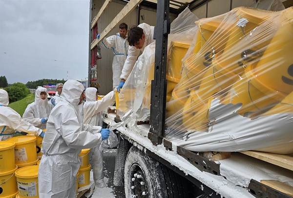 Am Einsatzort angekommen, stellte der Einsatzleiter fest, dass ein Sattelschlepper aus bislang unbekannter Ursache Probleme mit seiner Ladung bzw. Ladungssicherung bekam. Da es sich um flüssige Farbe handelte, verrutschten die Güter auf der Ladefläche, wobei teilweise Behälter zu Bruch kamen.