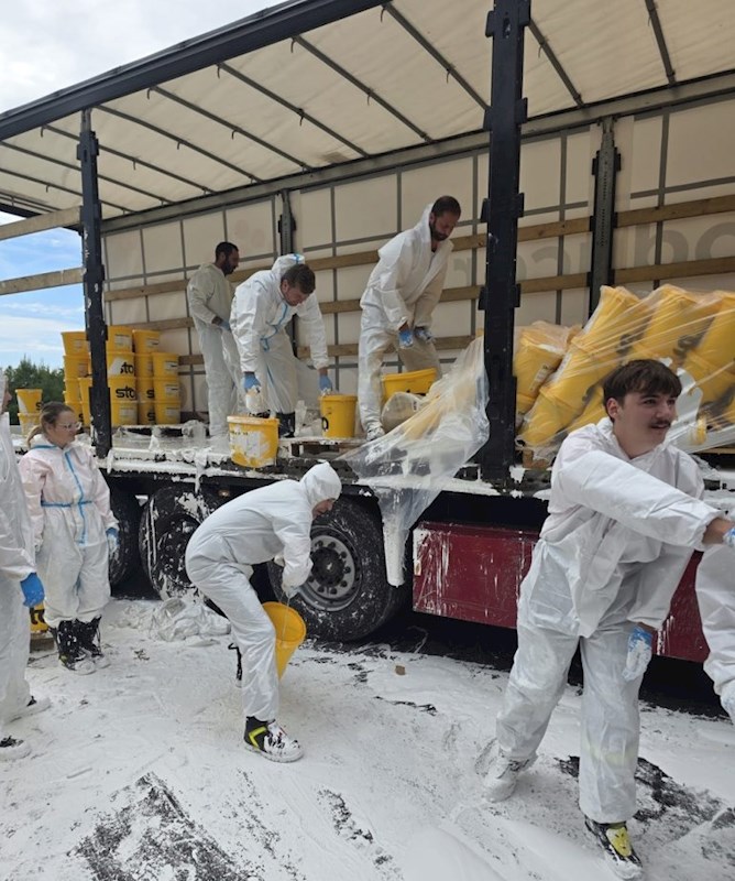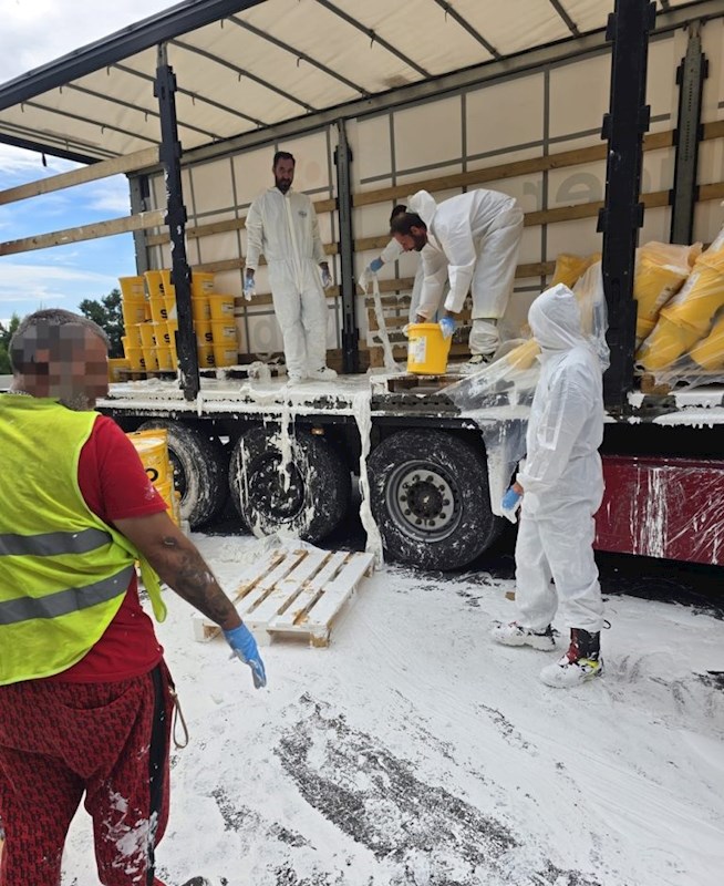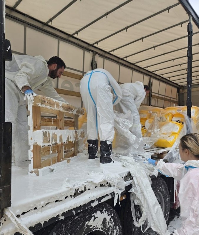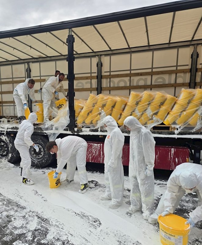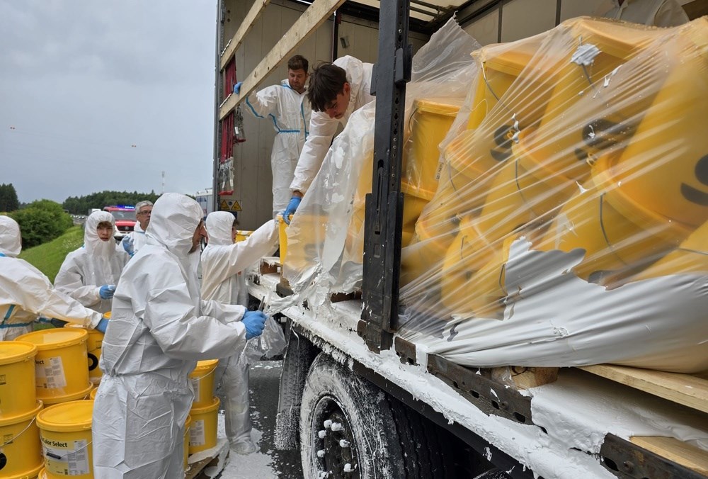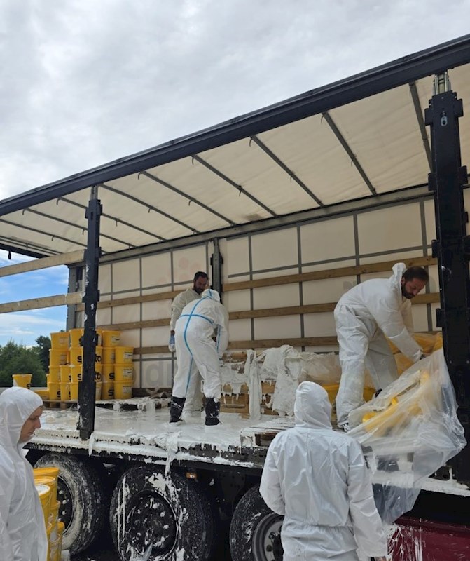 Am Einsatzort angekommen, stellte der Einsatzleiter fest, dass ein Sattelschlepper aus bislang unbekannter Ursache Probleme mit seiner Ladung bzw. Ladungssicherung bekam. Da es sich um flüssige Farbe handelte, verrutschten die Güter auf der Ladefläche, wobei teilweise Behälter zu Bruch kamen.