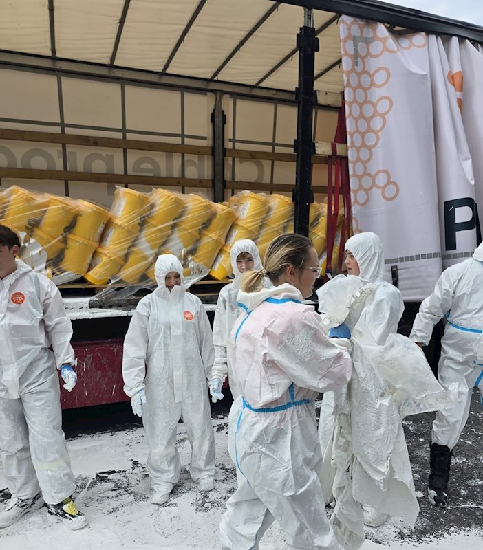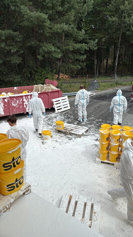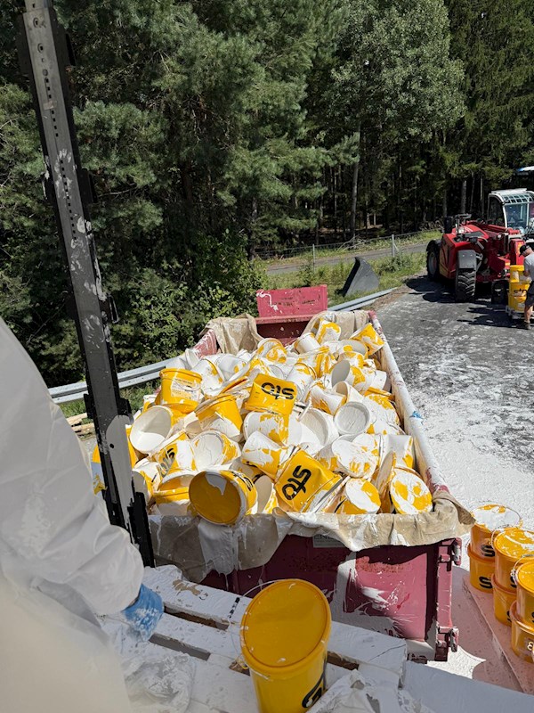 Unsere Aufgabe bestand im Absichern der Einsatzstelle, Entladen der Farbkübel mittels Muskelkraft sowie ordnungsgemäßer Übergabe an ein Entsorgungsunternehmen. Es bestand zu keiner Zeit eine Gefährdung für Menschen, Tiere oder Umwelt, da es sich um eine lösungsmittelfreie, umweltverträgliche Farbe für den Innenraum handelte.